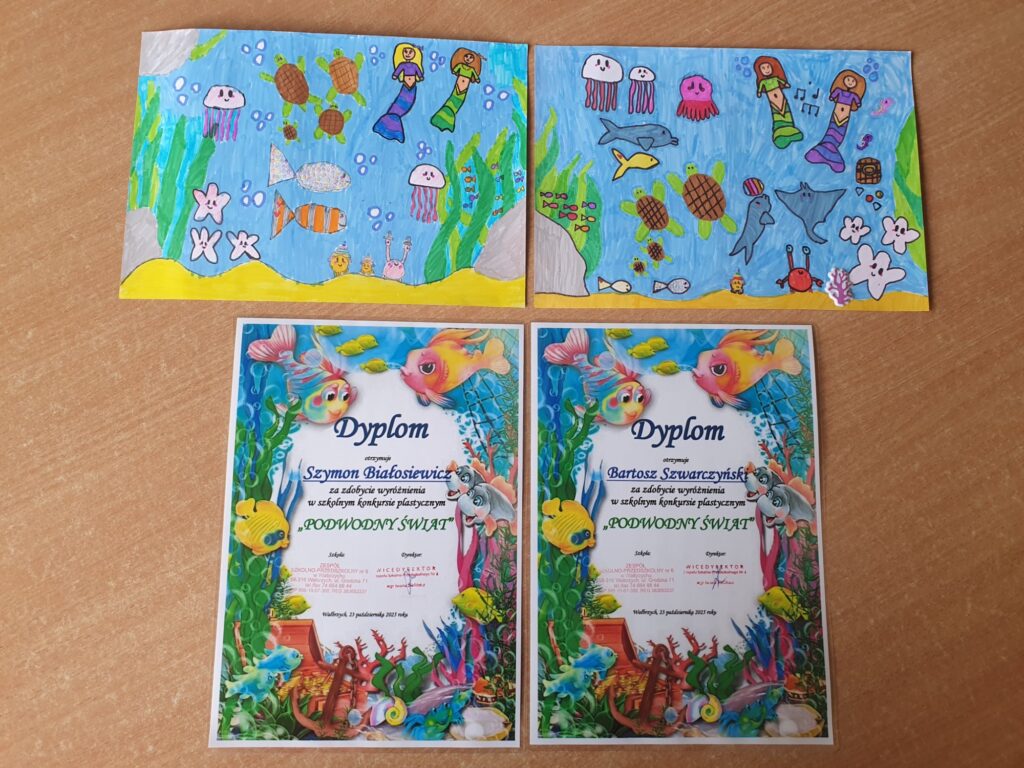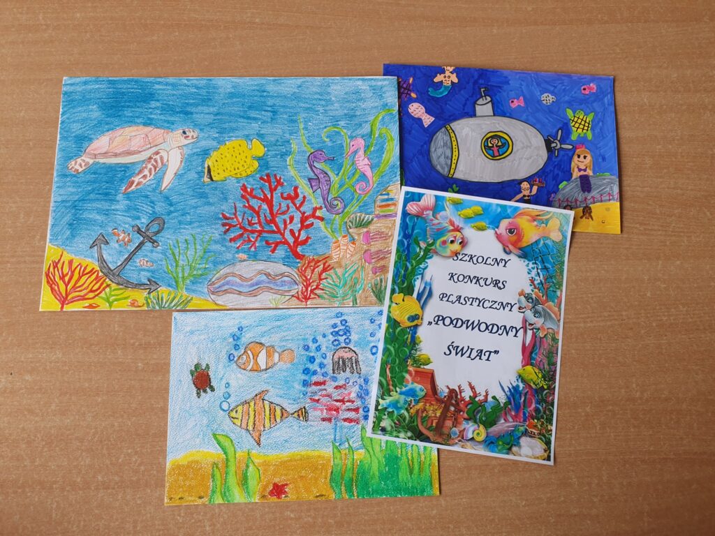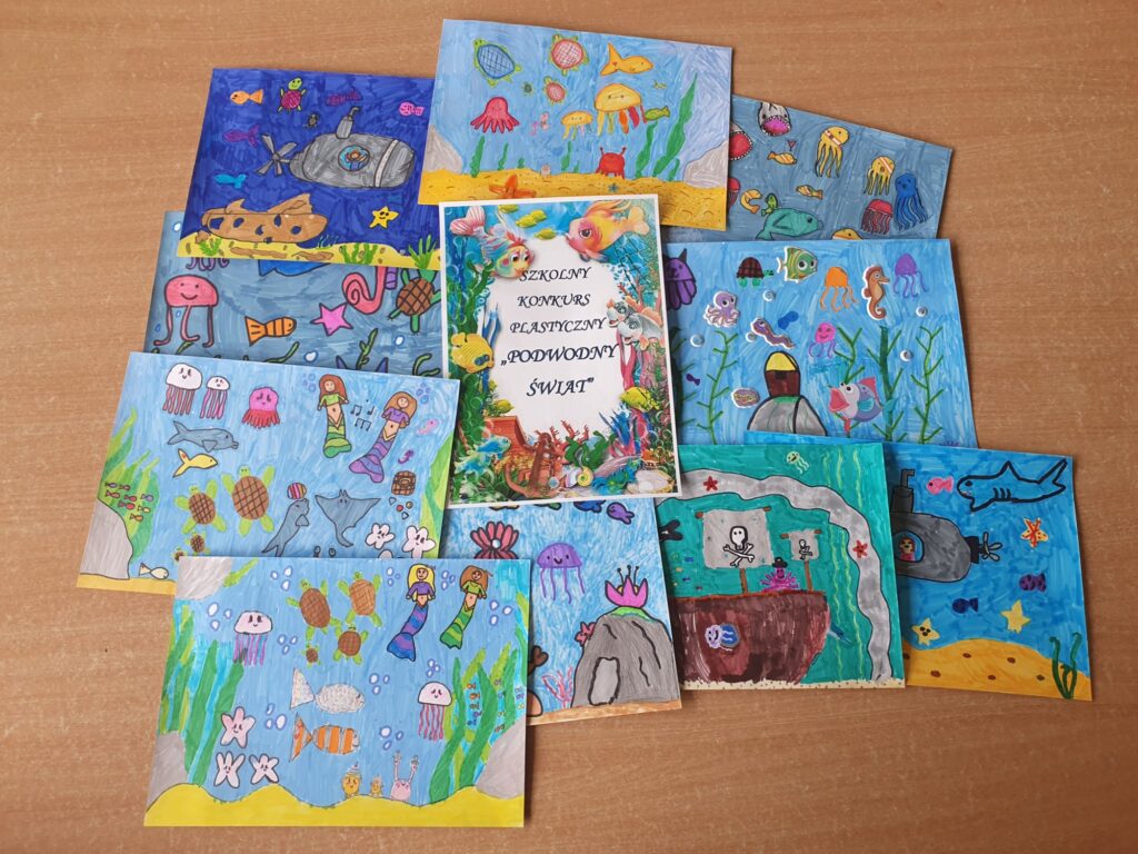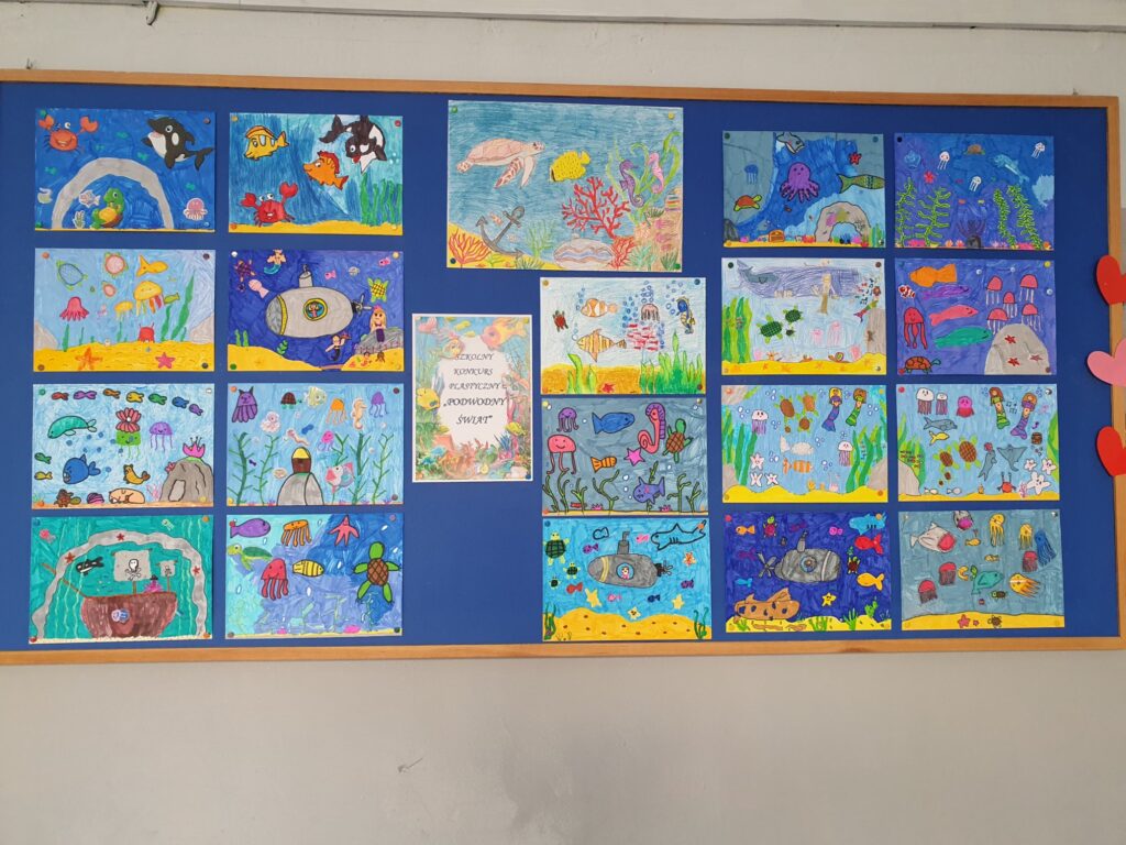 Dnia 23 października 2025 roku odbyło się rozstrzygnięcie szkolnego konkursu plastycznego „PODWODNY ŚWIAT”. Konkurs adresowany do najmłodszych uczniów naszej szkoły z klas I – III zorganizowały panie ze świetlicy szkolnej. Do artystycznych zmagań zgłoszono 39 prac ukazujących piękno podwodnego życia w morzach i oceanach wykonanych różnorodnymi technikami plastycznymi. Uczestnicy wykazali się niesamowitą wyobraźnią, pomysłowością oraz ogromnym zaangażowaniem.