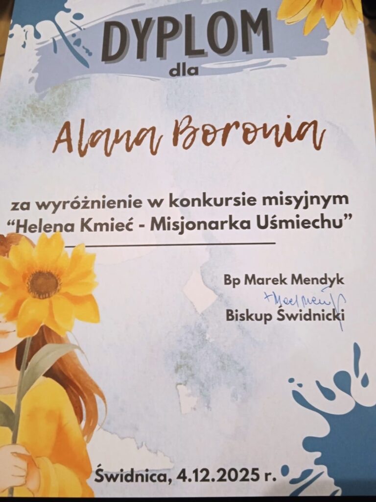 4 grudnia w Wyższym Seminarium Duchownym w Świdnicy odbyła się uroczysta gala podsumowująca Diecezjalny Konkurs Plastyczny „Helena Kmieć – Misjonarka Miłości. Uroczystość rozpoczęła się od wręczenia, przez Ks. Biskupa Marka Mendyka, nagród laureatom. Naszą szkołę reprezentowali Lea Grzegorzewicz uczennica kl. II a, która zajęła III miejsce w kategorii kl. I-III oraz Alan Boroń, uczeń kl. VI c, który otrzymał wyróżnienie w kategorii kl. IV-VI